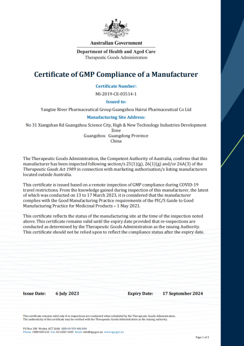 - 揚(yáng)子江藥業(yè)集團(tuán):廣州海瑞藥業(yè)車間通過(guò)澳大利亞TGA GMP認(rèn)證